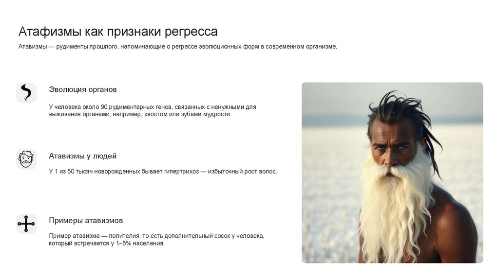 Атафизмы как признаки регрессаАтавизмы — рудименты прошлого, напоминающие о регрессе эволюционных форм в современном организме.