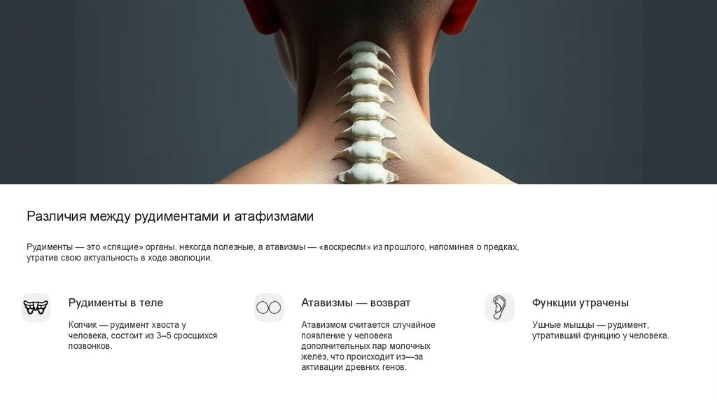Различия между рудиментами и атафизмамиРудименты — это «спящие» органы, некогда полезные, а атавизмы — «воскресли» из прошлого, напоминая о предках,