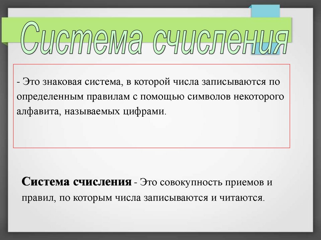 - Это знаковая система, в которой числа записываются поопределенным правилам с помощью символов некоторого