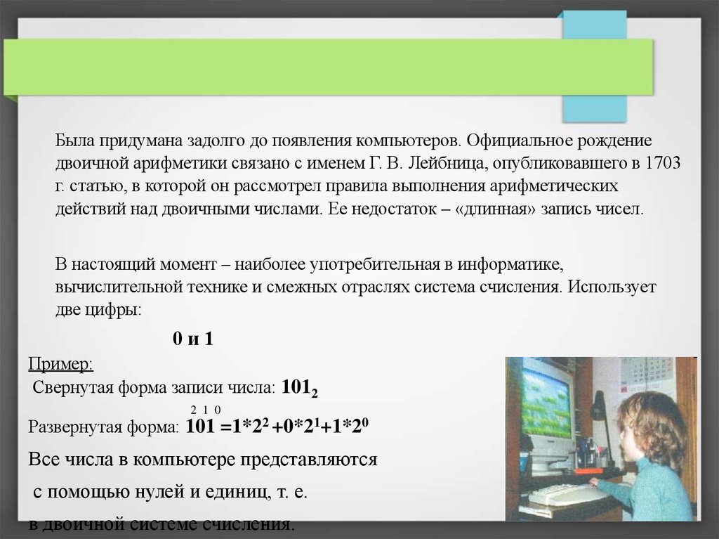 Была придумана задолго до появления компьютеров. Официальное рождениедвоичной арифметики связано с именем Г. В. Лейбница, опубликовавшего в 1703