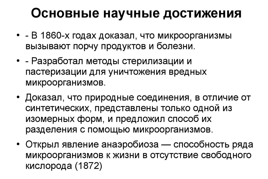 Основные научные достижения- В 1860-х годах доказал, что микроорганизмы