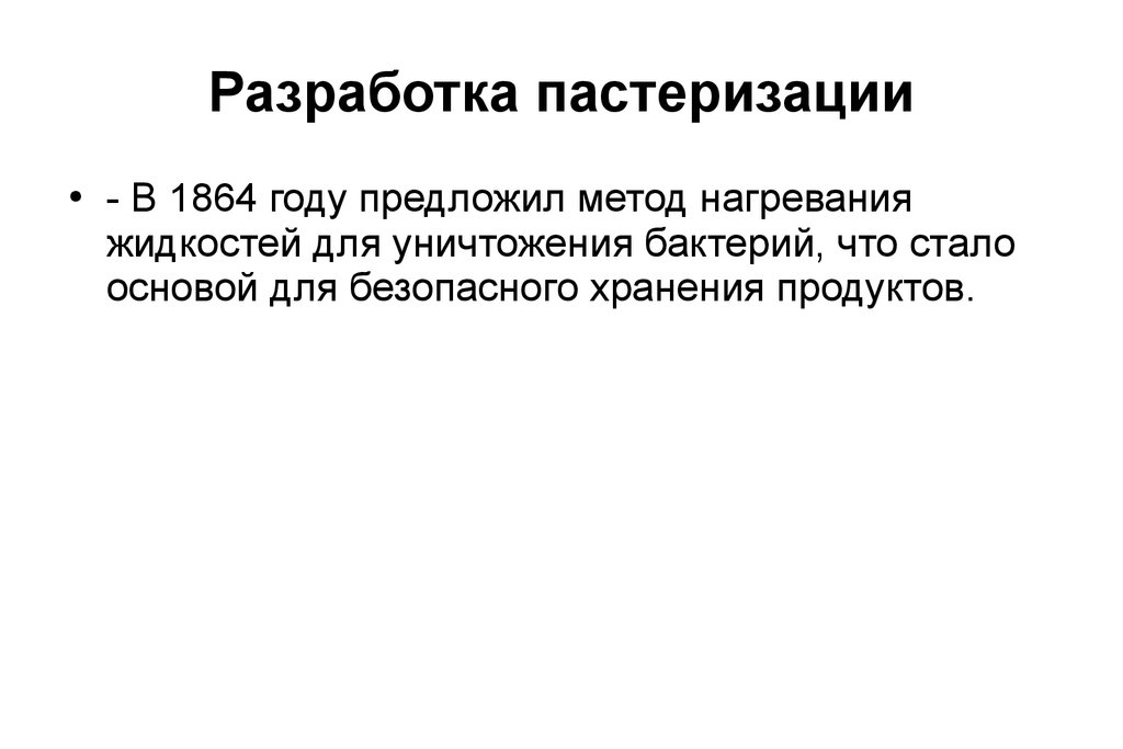 Разработка пастеризации- В 1864 году предложил метод нагревания