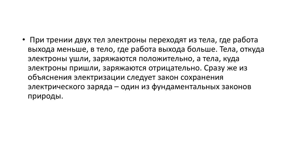 • При трении двух тел электроны переходят из тела, где работавыхода меньше, в тело, где работа выхода больше. Тела, откуда
