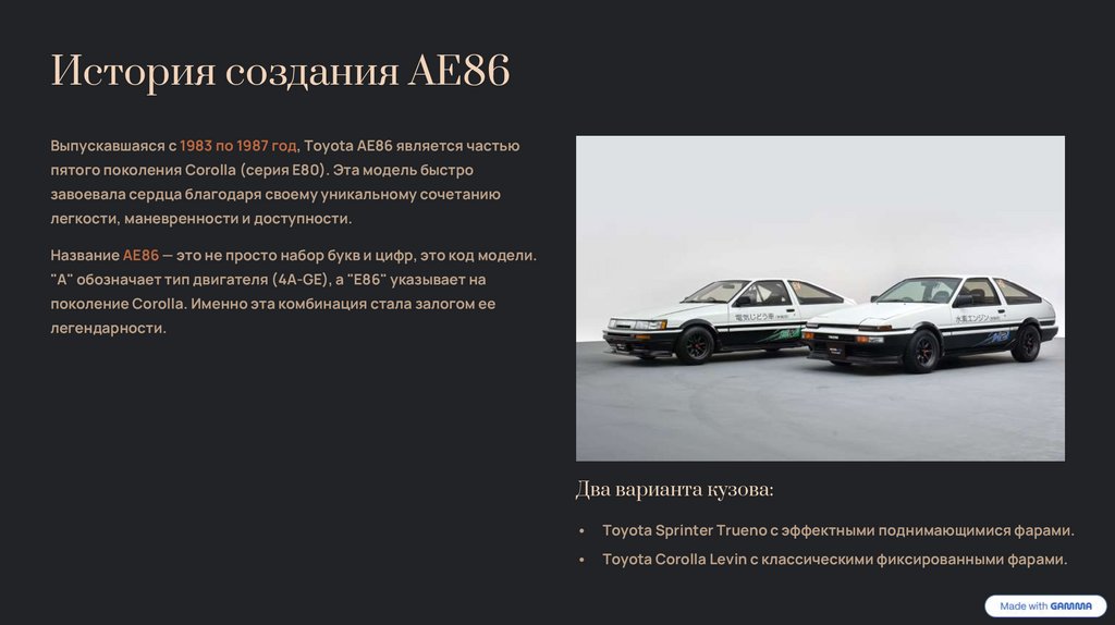 История создания AE86Выпускавшаяся с 1983 по 1987 год, Toyota AE86 является частью
