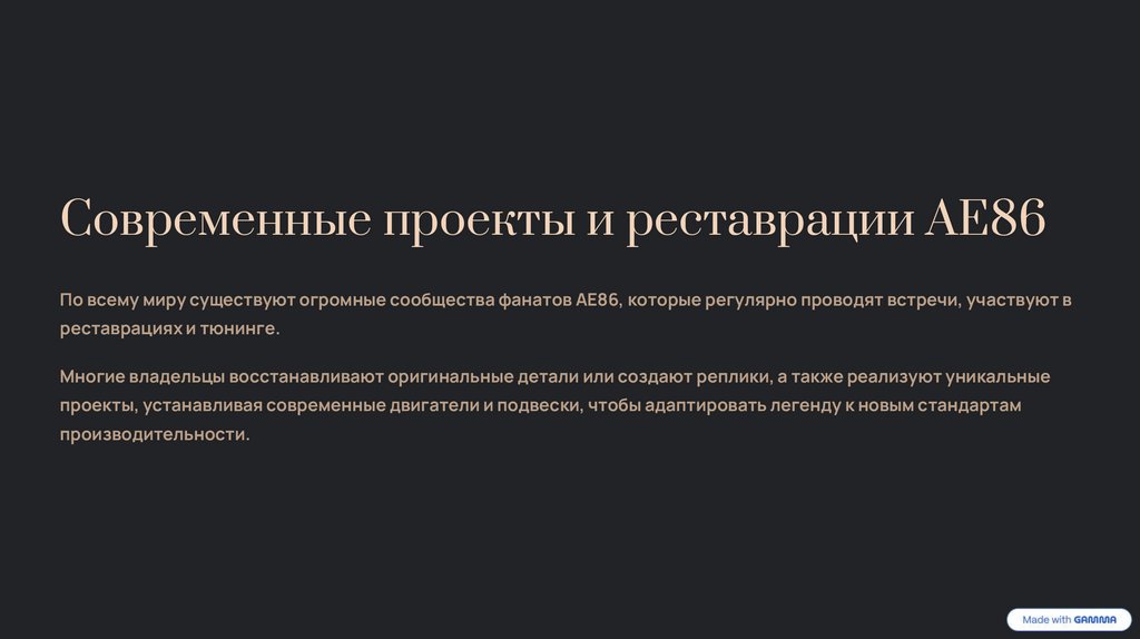 Современные проекты и реставрации AE86По всему миру существуют огромные сообщества фанатов AE86, которые регулярно проводят встречи, участвуют в