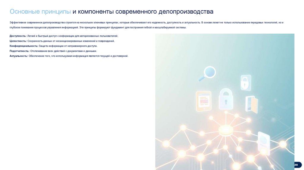 Основные принципы и компоненты современного делопроизводстваЭффективное современное делопроизводство строится на нескольких ключевых принципах, которые обеспечивают его надежность, доступность и актуальность. В основе лежит не только использование передовых технологий, но и