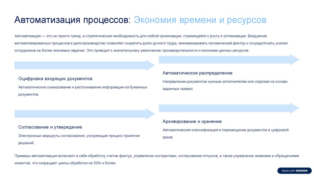 автоматизированных процессов в делопроизводство позволяет сократить долю ручного труда, минимизировать человеческий фактор и сосредоточить усилия