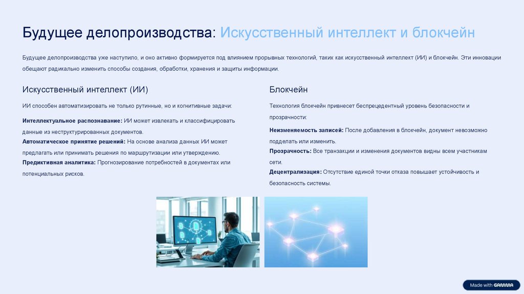 Будущее делопроизводства: Искусственный интеллект и блокчейнБудущее делопроизводства уже наступило, и оно активно формируется под влиянием прорывных технологий, таких как искусственный интеллект (ИИ) и блокчейн. Эти инновации