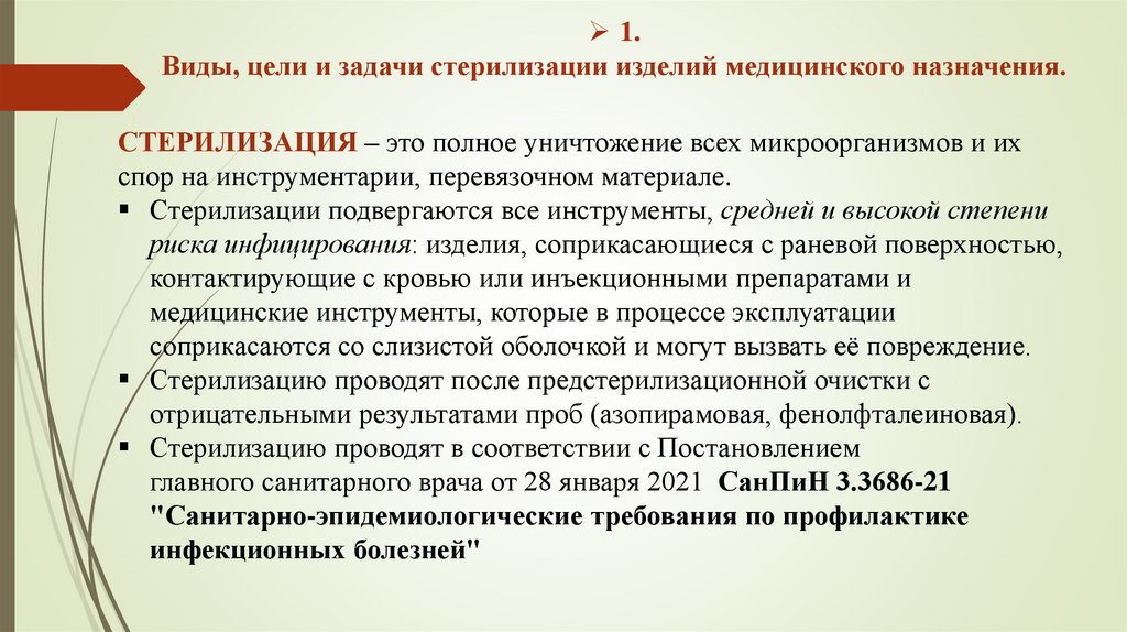 1. Виды, цели и задачи стерилизации изделий медицинскогоназначения.