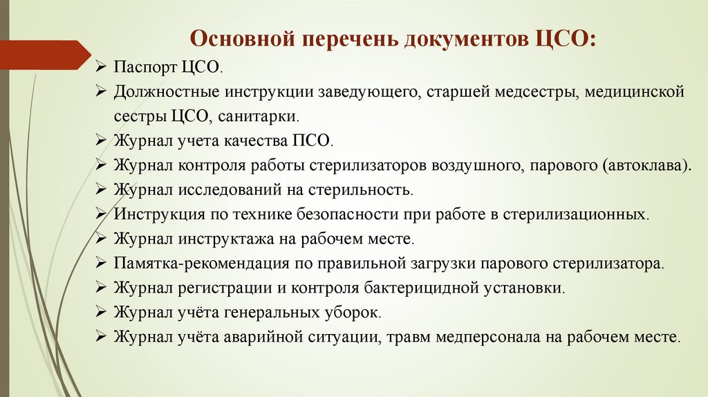 Основной перечень документов ЦСО:Паспорт ЦСО.