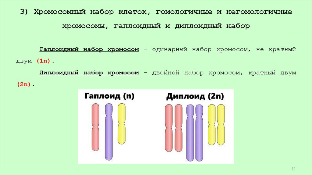 3) Хромосомный набор клеток, гомологичные и негомологичныехромосомы, гаплоидный и диплоидный набор