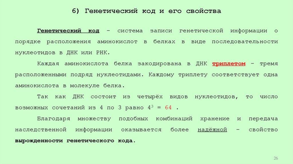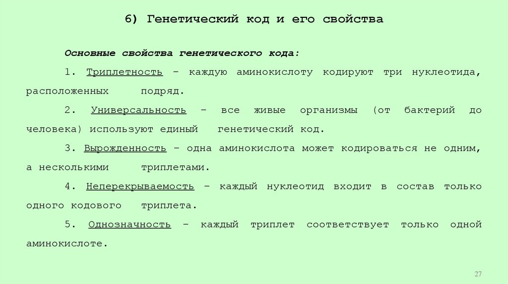 6) Генетический код и его свойстваОсновные свойства генетического кода: