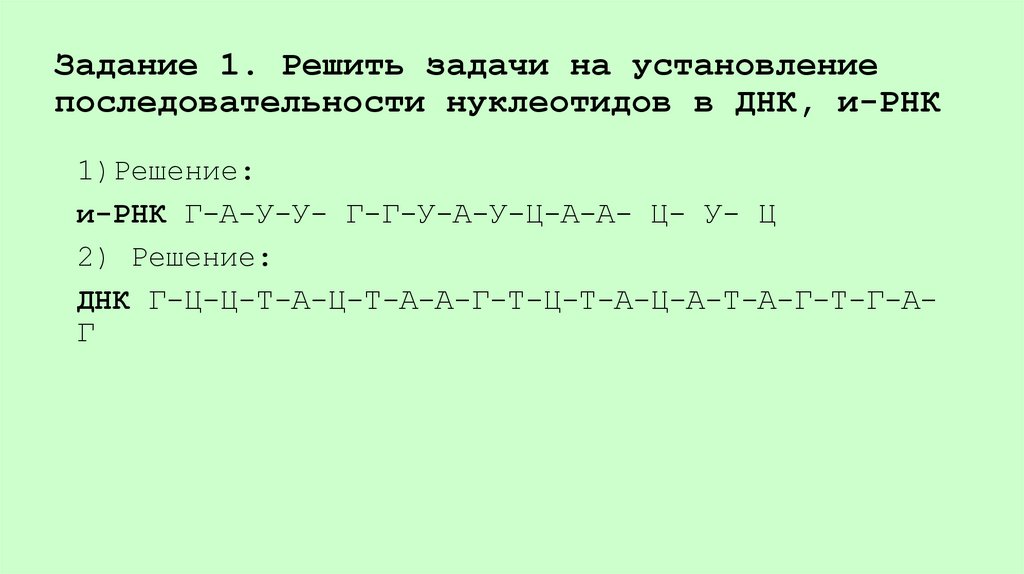 Задание 1. Решить задачи на установлениепоследовательности нуклеотидов в ДНК, и-РНК