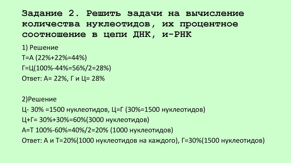 Задание 2. Решить задачи на вычислениеколичества нуклеотидов, их процентное