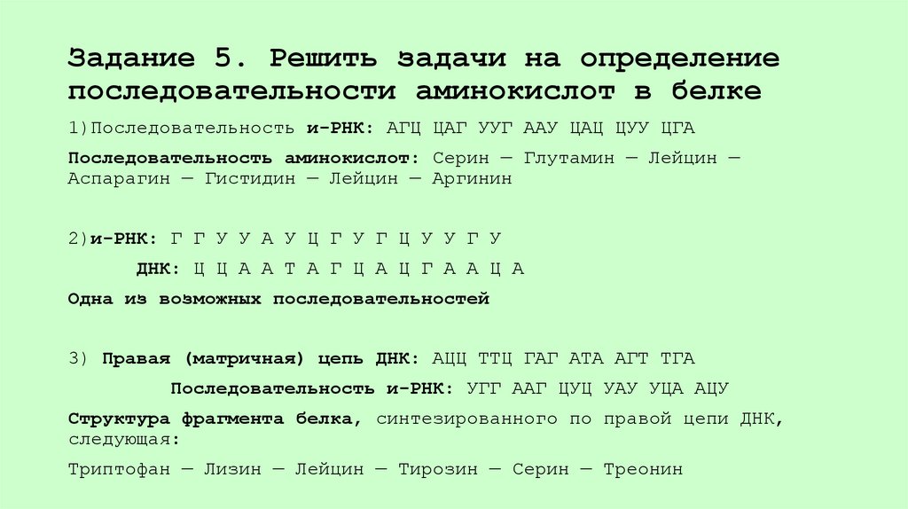 Задание 5. Решить задачи на определениепоследовательности аминокислот в белке