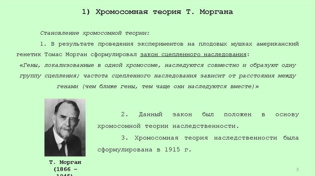 1) Хромосомная теория Т. МорганаСтановление хромосомной теории: