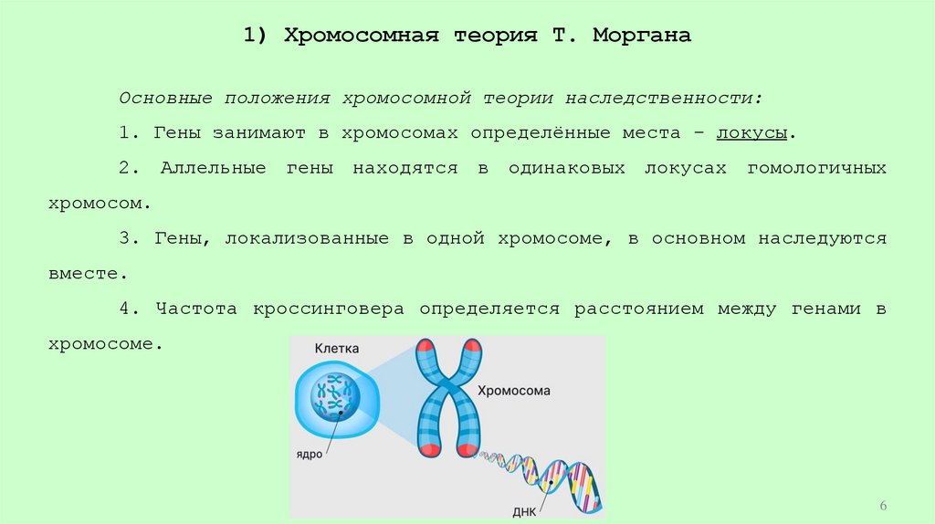 1) Хромосомная теория Т. МорганаОсновные положения хромосомной теории наследственности:
