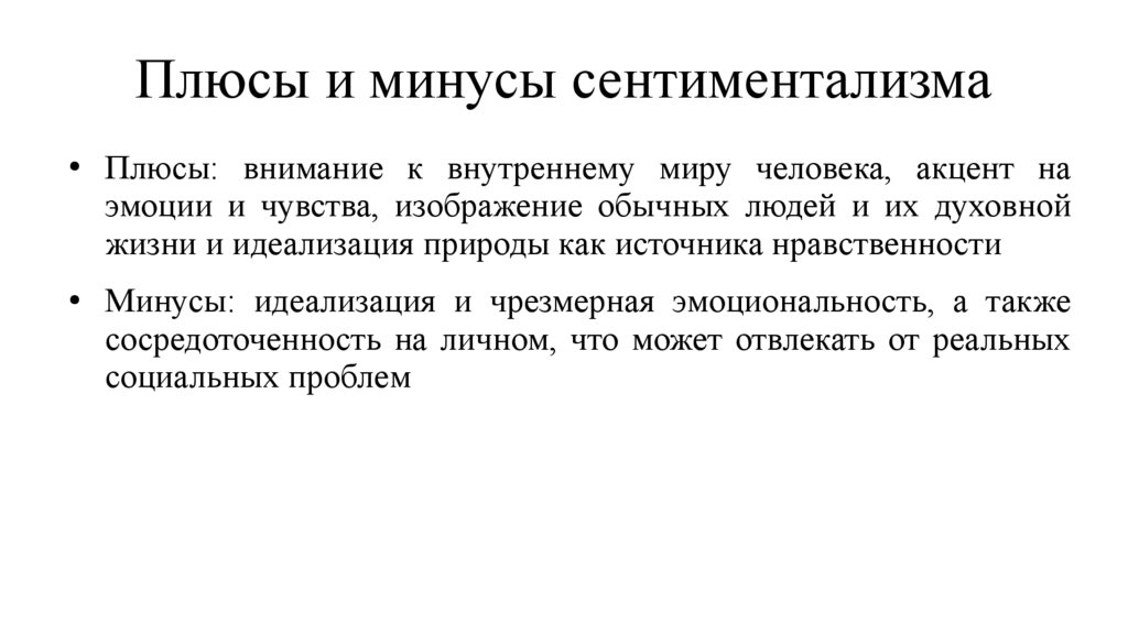 Плюсы и минусы сентиментализмаПлюсы: внимание к внутреннему миру человека, акцент на