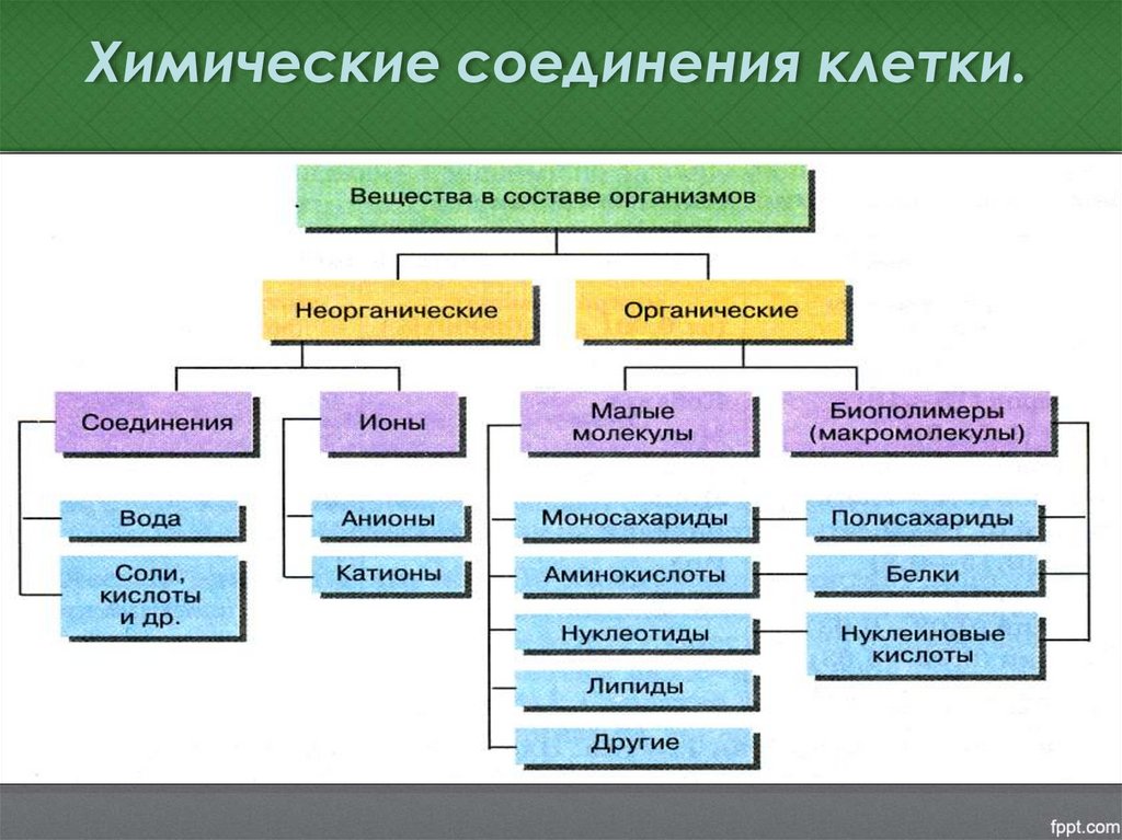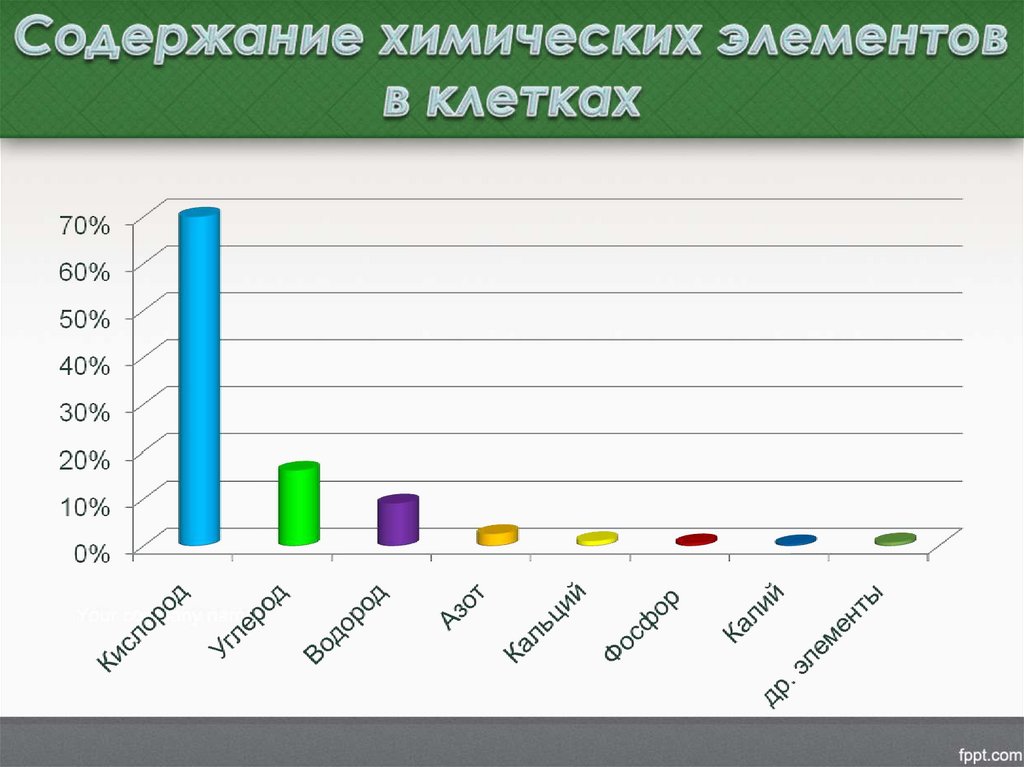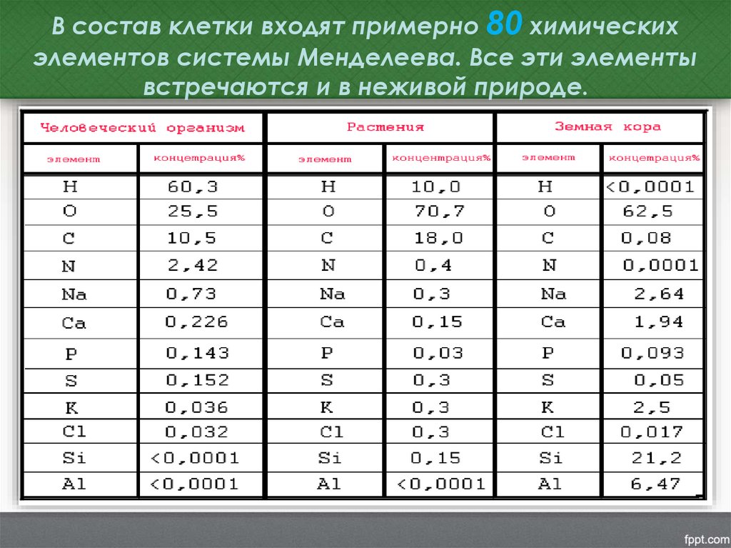 В состав клетки входят примерно 80 химическихэлементов системы Менделеева. Все эти элементы