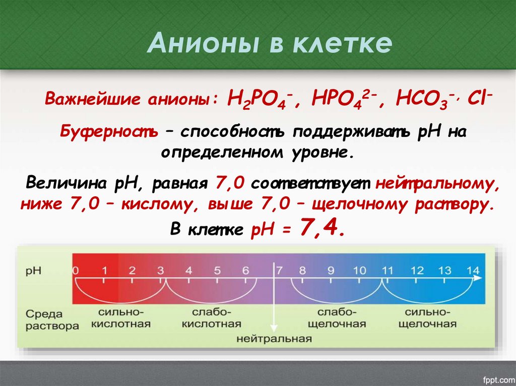 Анионы в клеткеВажнейшие анионы: Н2РО4-, НРО42-, НСО3-, СlБуферност ь – способност ь поддерживат ь рН на