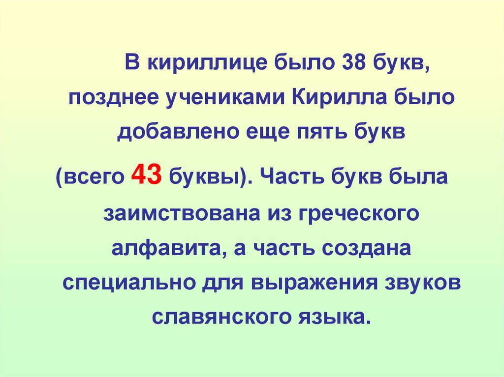 В кириллице было 38 букв,позднее учениками Кирилла было