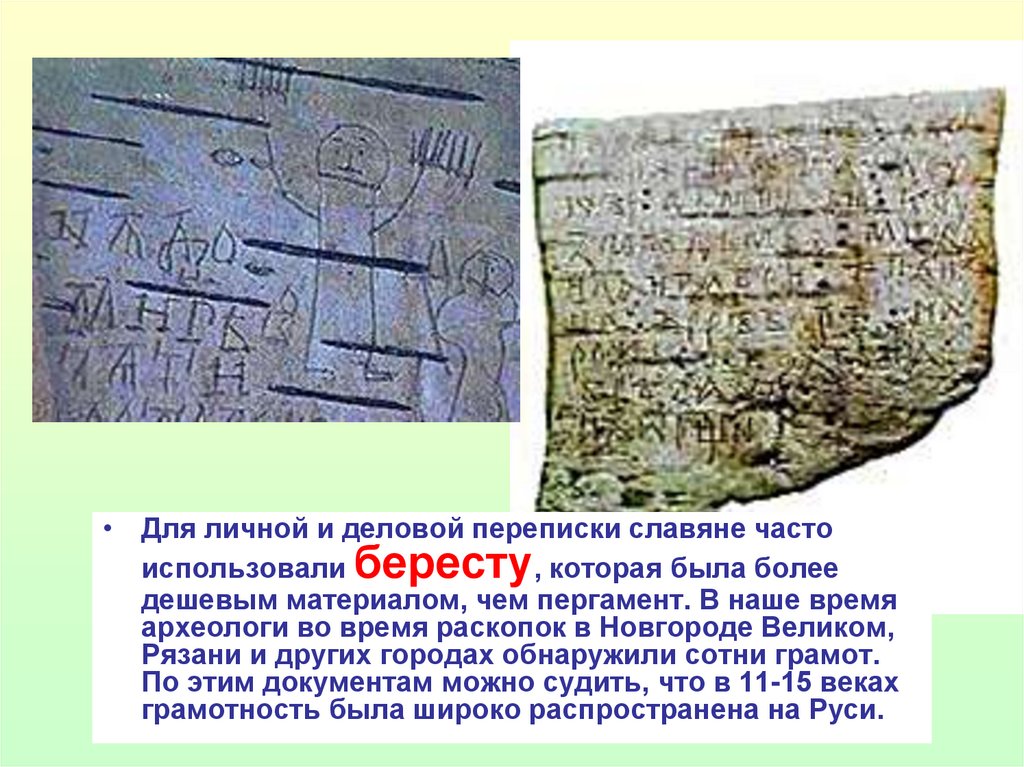 • Для личной и деловой переписки славяне частоиспользовали бересту, которая была более