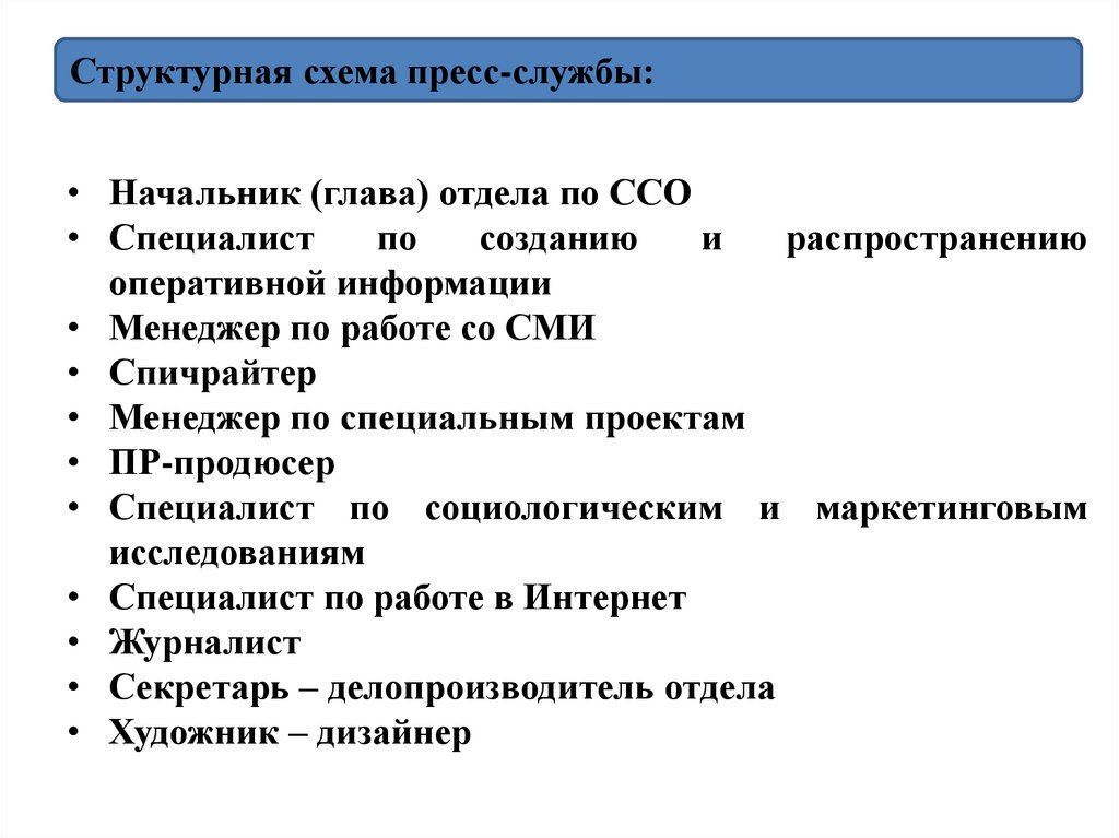 Структурная схема пресс-службы:• Начальник (глава) отдела по ССО