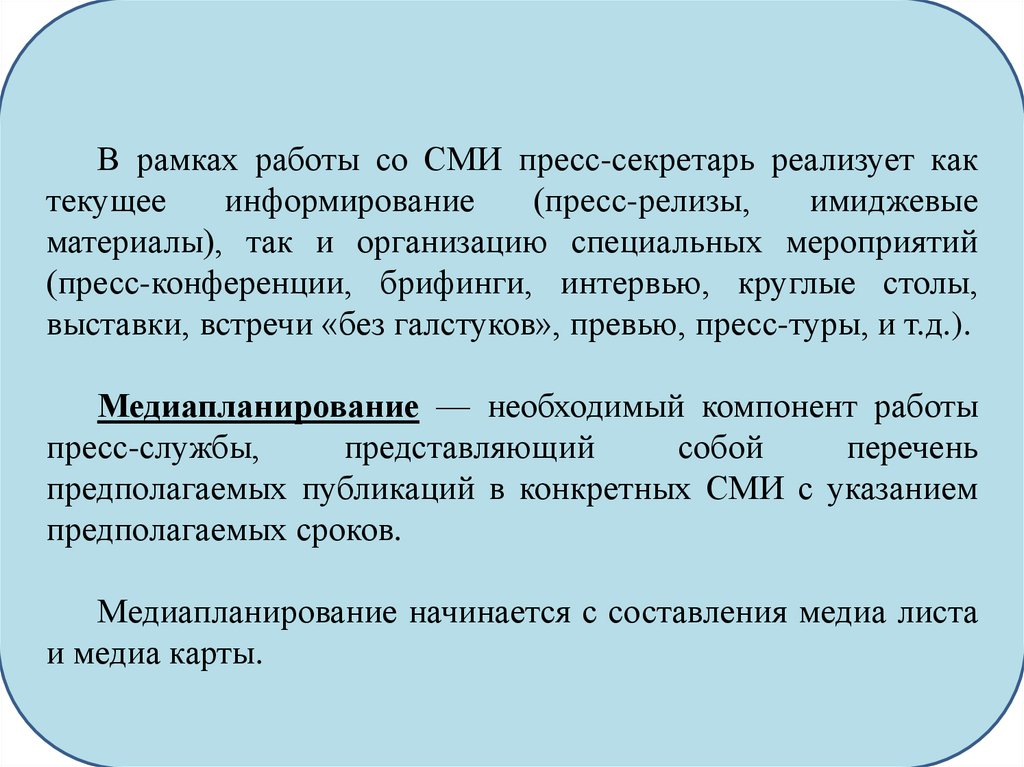 В рамках работы со СМИ пресс-секретарь реализует кактекущее