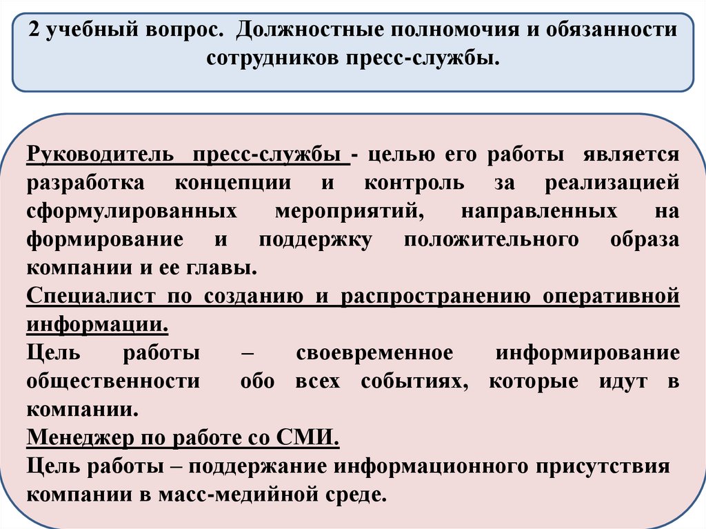 2 учебный вопрос. Должностные полномочия и обязанностисотрудников пресс-службы.