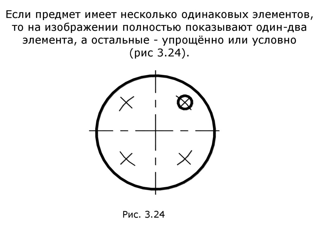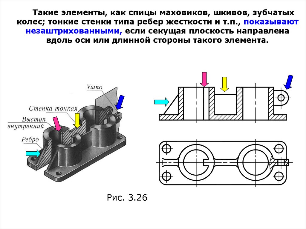 Такие элементы, как спицы маховиков, шкивов, зубчатыхколес; тонкие стенки типа ребер жесткости и т.п., показывают