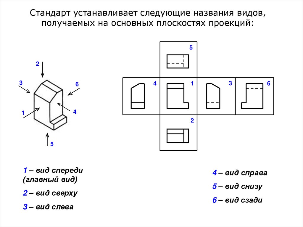Стандарт устанавливает следующие названия видов,получаемых на основных плоскостях проекций: