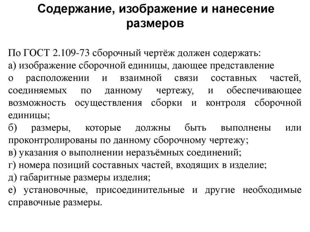 По ГОСТ 2.109-73 сборочный чертёж должен содержать: