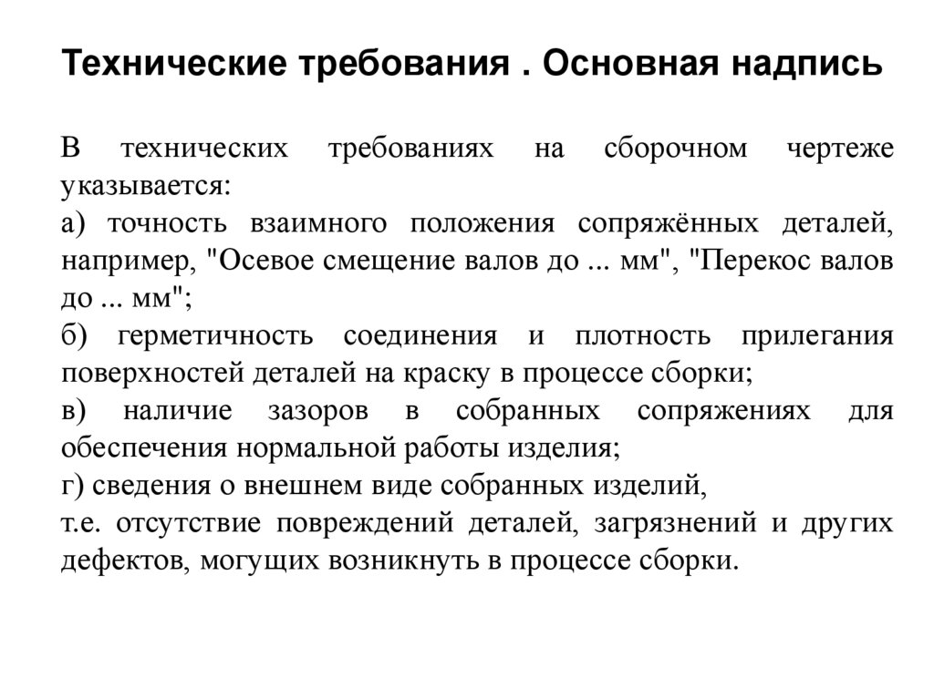 Технические требования . Основная надписьВ технических требованиях на сборочном чертеже
