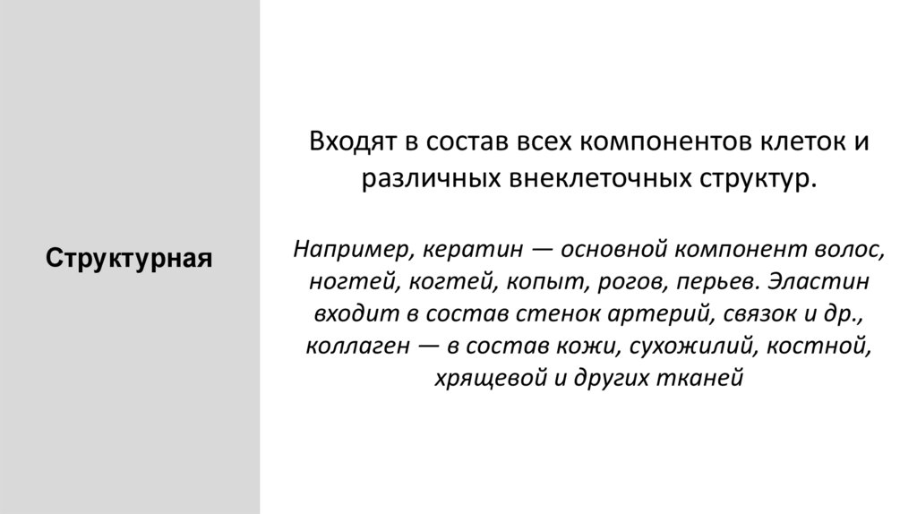 Входят в состав всех компонентов клеток иразличных внеклеточных структур.