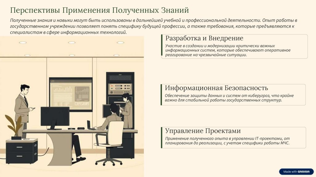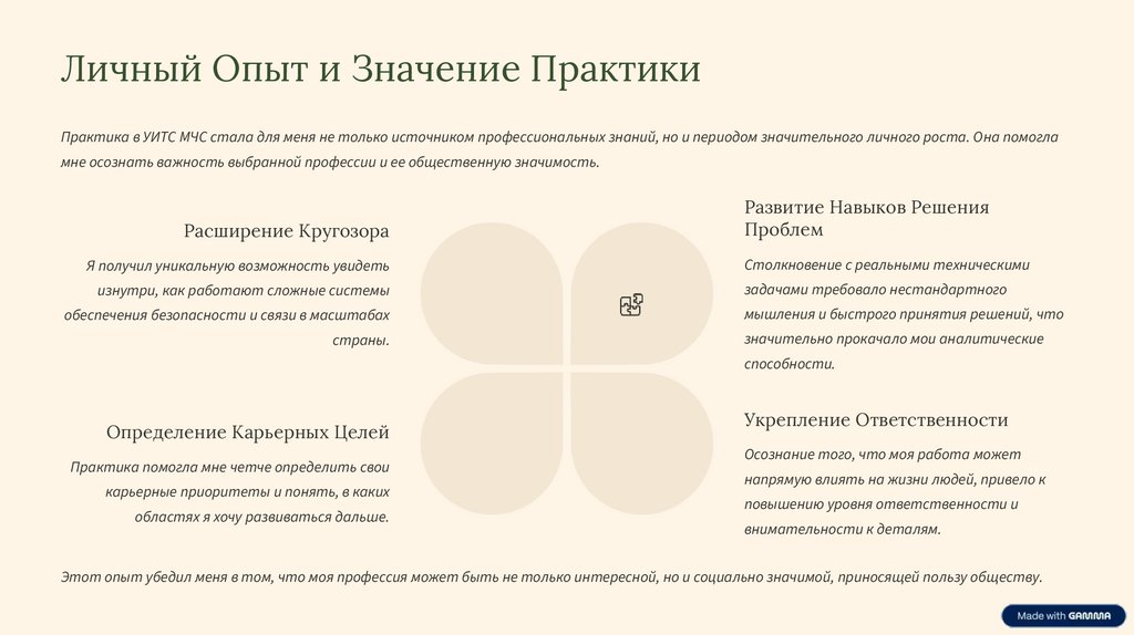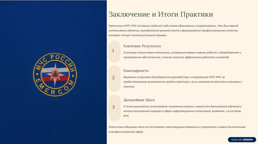 Заключение и Итоги ПрактикиПрактика в УИТС МЧС оставила глубокий след в моем образовании и мировоззрении. Это был период