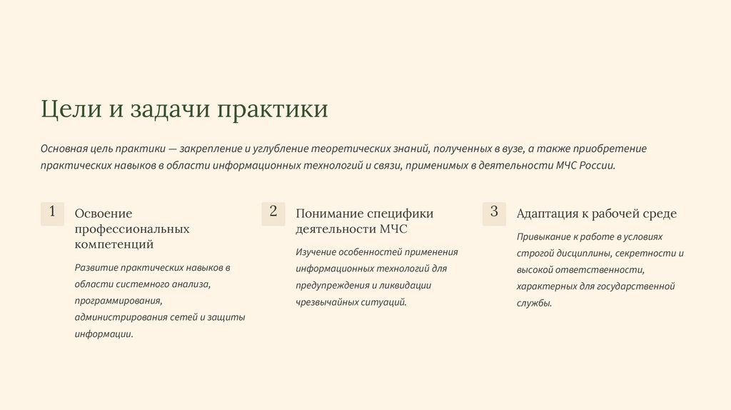 Цели и задачи практикиОсновная цель практики — закрепление и углубление теоретических знаний, полученных в вузе, а также приобретение