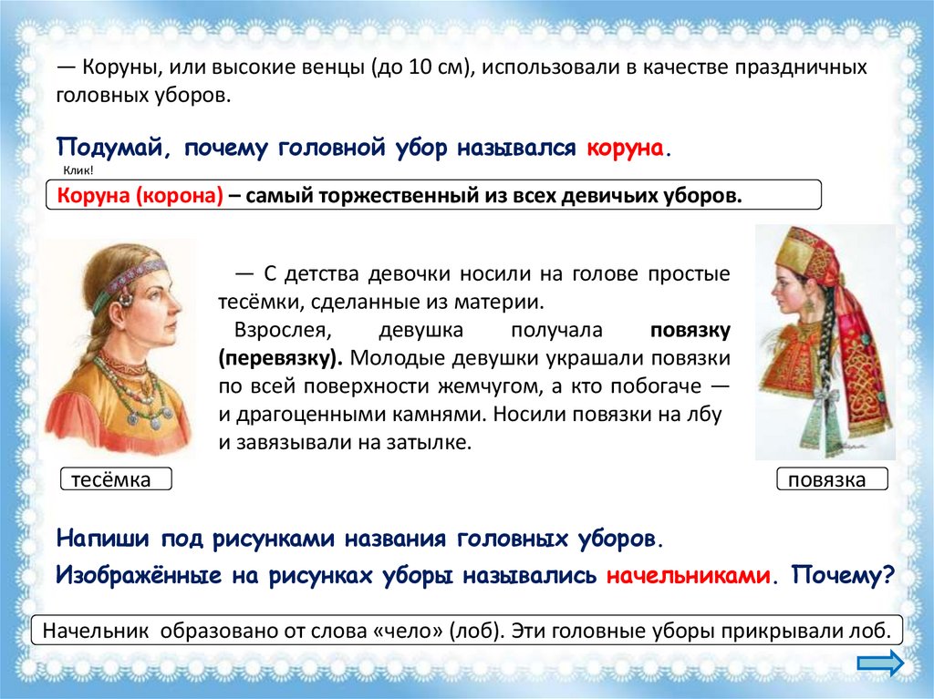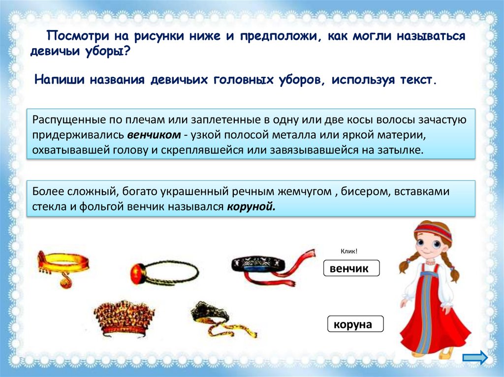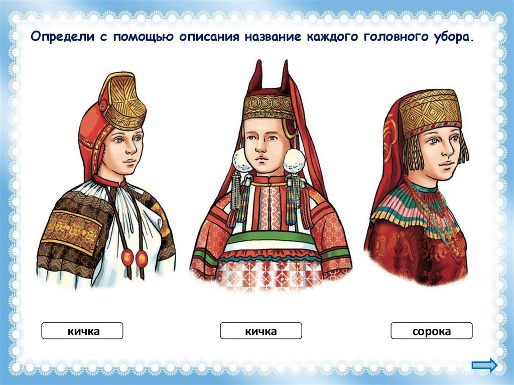 Посмотри на рисунки ниже и предположи, как могли называтьсядевичьи уборы?