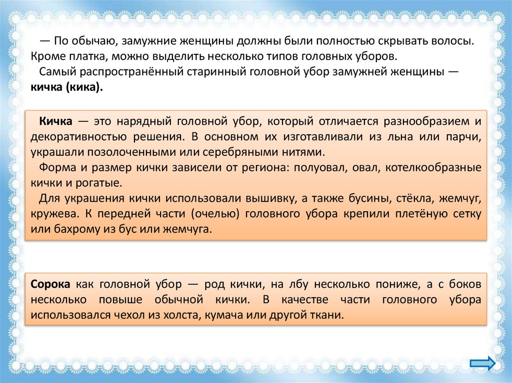 Сорока как головной убор — род кички, на лбу несколько пониже, а с боков