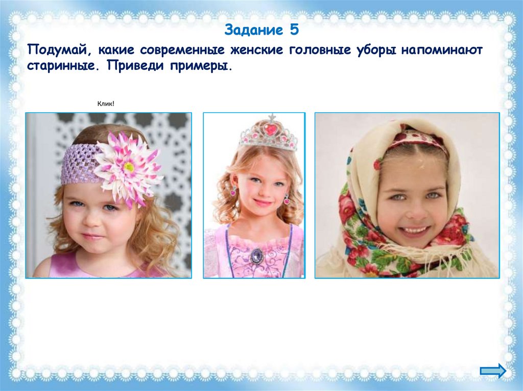Задание 5Подумай, какие современные женские головные уборы напоминают