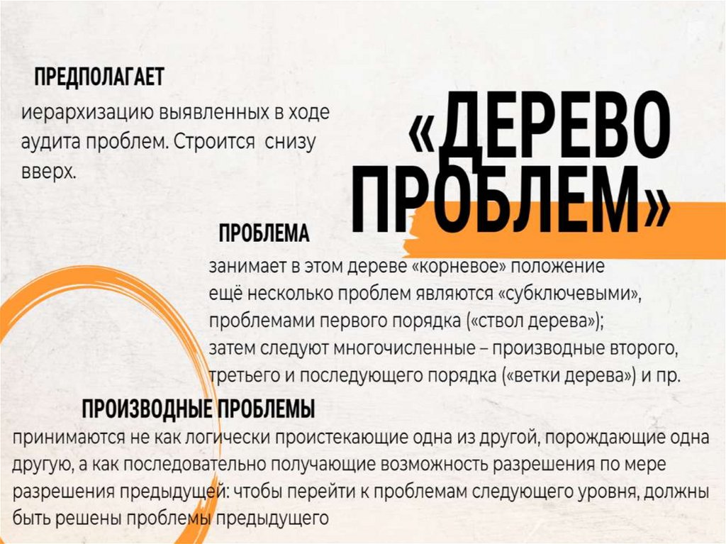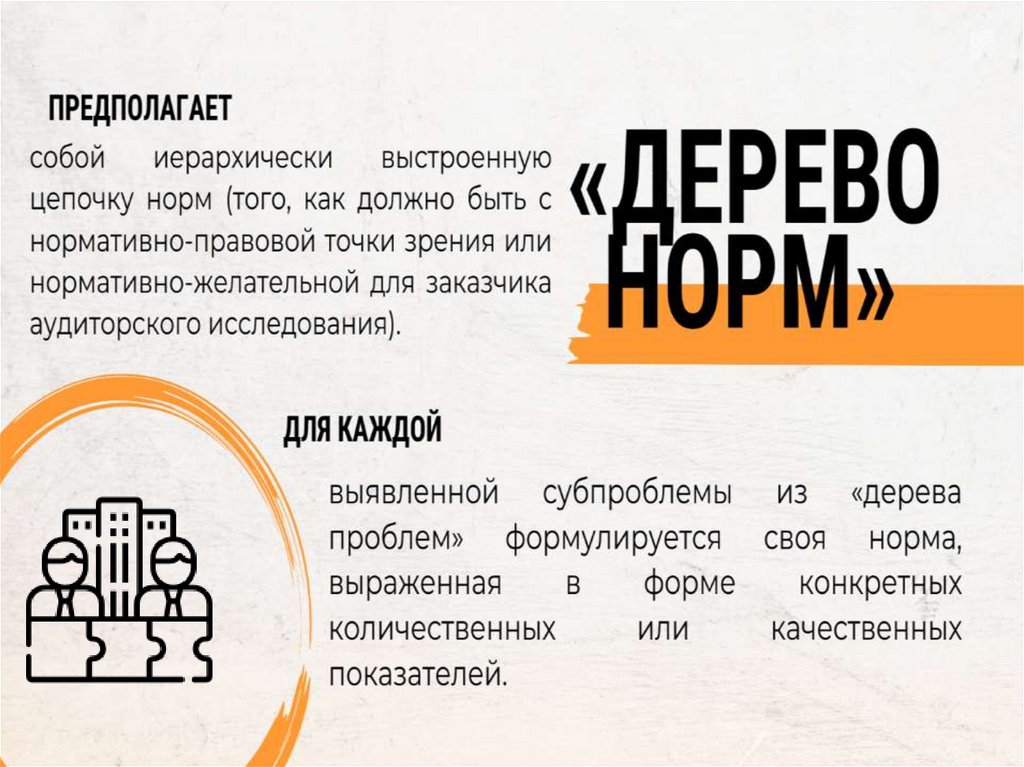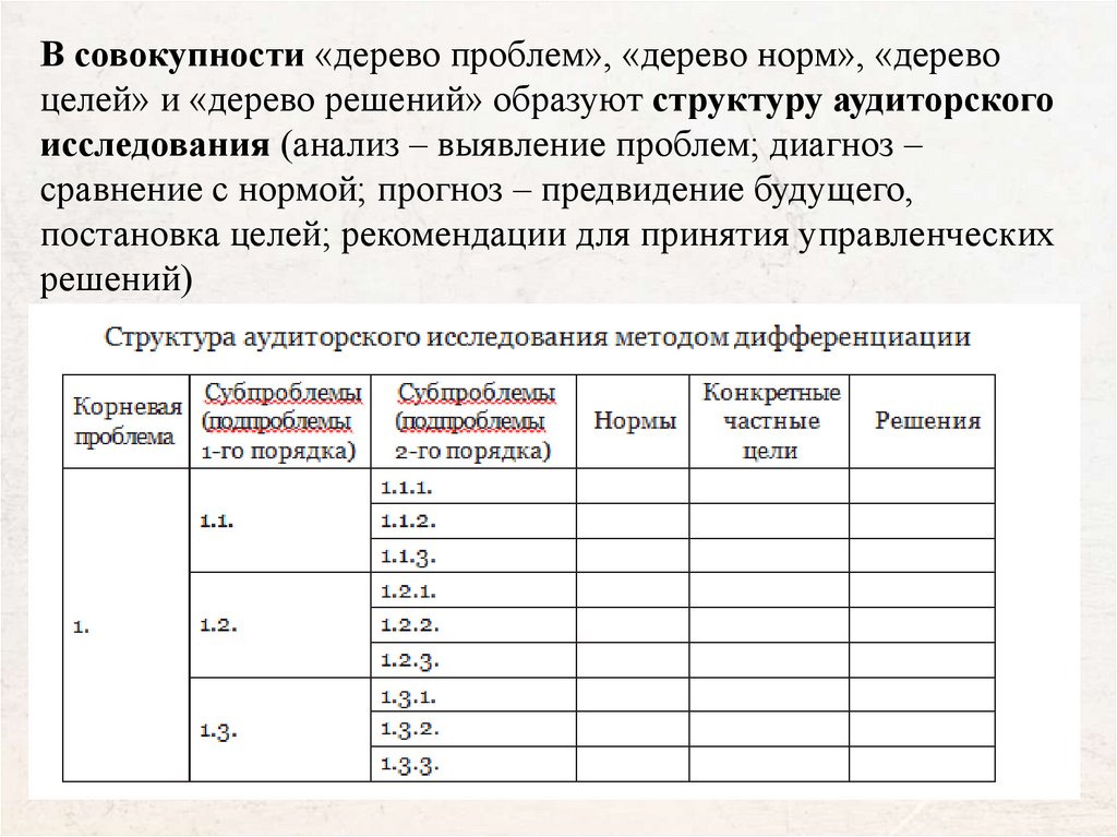 В совокупности «дерево проблем», «дерево норм», «деревоцелей» и «дерево решений» образуют структуру аудиторского