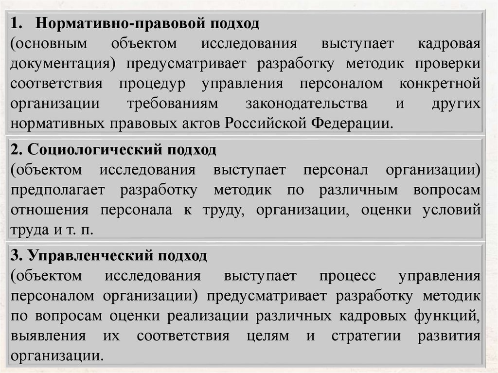 1. Нормативно-правовой подход(основным объектом исследования выступает кадровая
