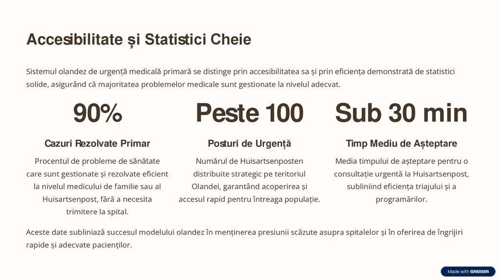 Accesibilitate și Statistici CheieSistemul olandez de urgență medicală primară se distinge prin accesibilitatea sa și prin eficiența demonstrată de statistici
