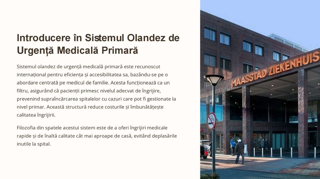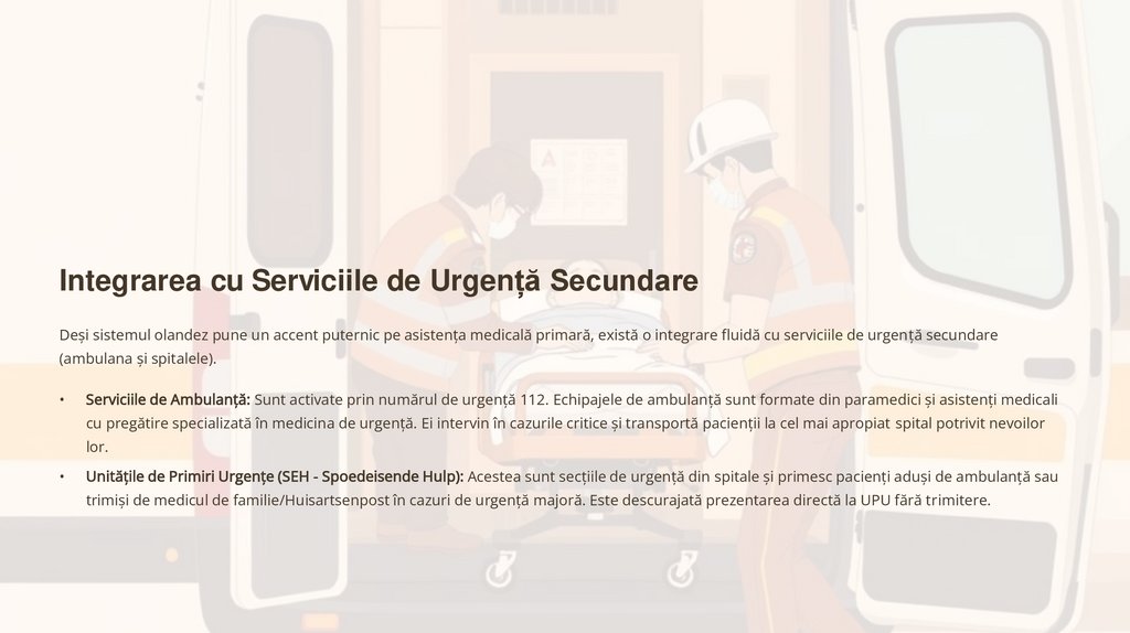 Integrarea cu Serviciile de Urgență SecundareDeși sistemul olandez pune un accent puternic pe asistența medicală primară, există o integrare fluidă cu serviciile de urgență secundare