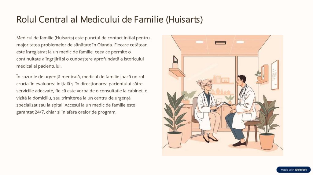 Rolul Central al Medicului de Familie (Huisarts)Medicul de familie (Huisarts) este punctul de contact inițial pentru