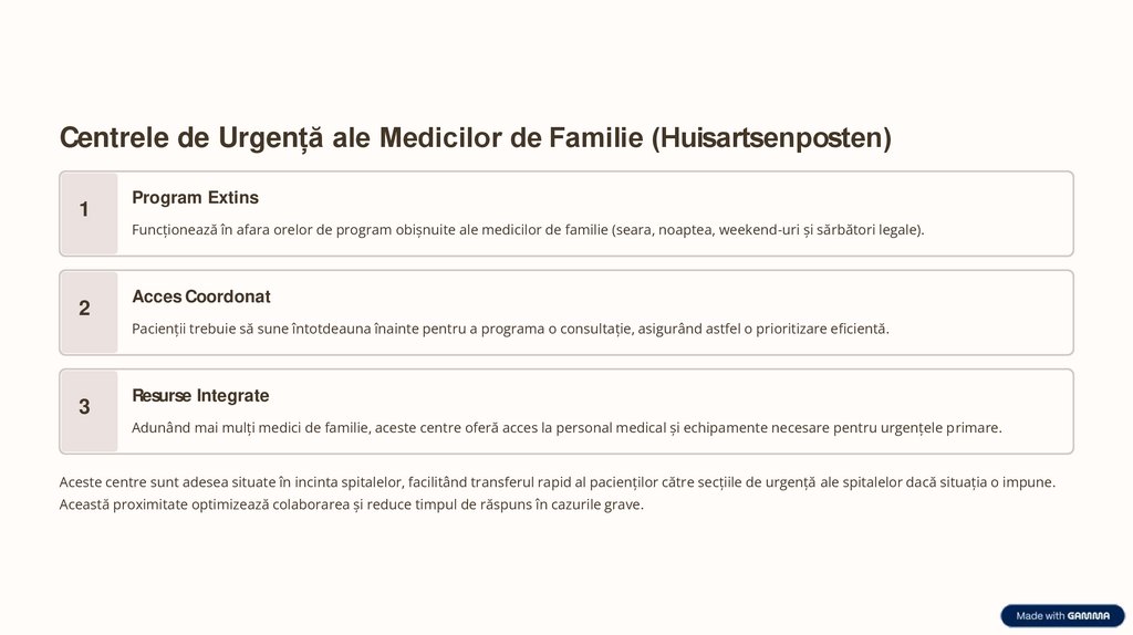 Funcționează în afara orelor de program obișnuite ale medicilor de familie (seara, noaptea, weekend-uri și sărbători legale).