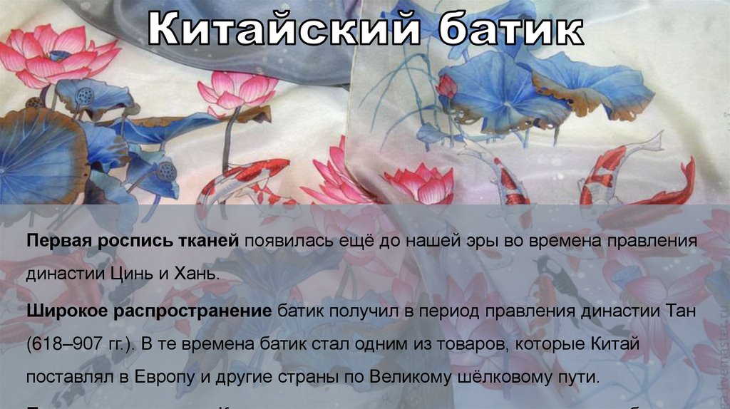 Первая роспись тканей появилась ещё до нашей эры во времена правлениядинастии Цинь и Хань.