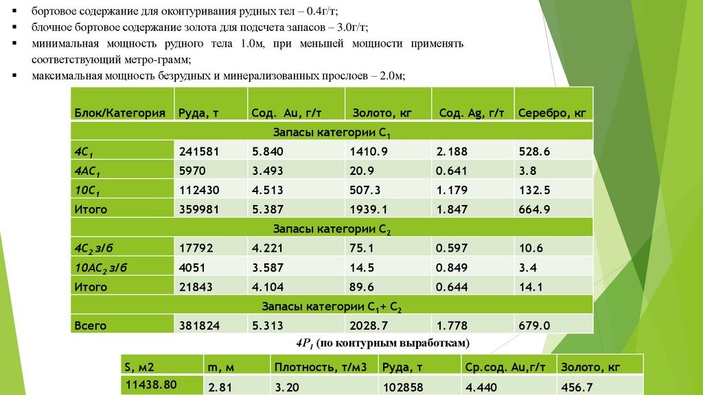 бортовое содержание для оконтуривания рудных тел – 0.4г/т;блочное бортовое содержание золота для подсчета запасов – 3.0г/т;