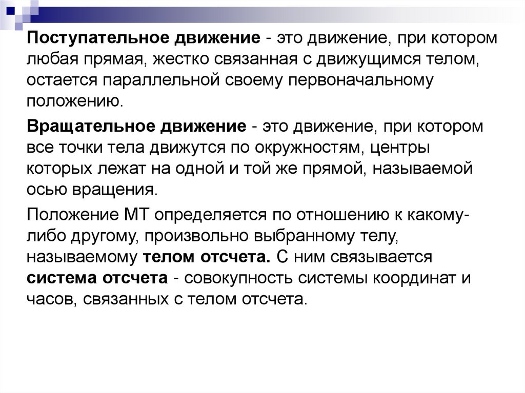 Поступательное движение - это движение, при которомлюбая прямая, жестко связанная с движущимся телом,