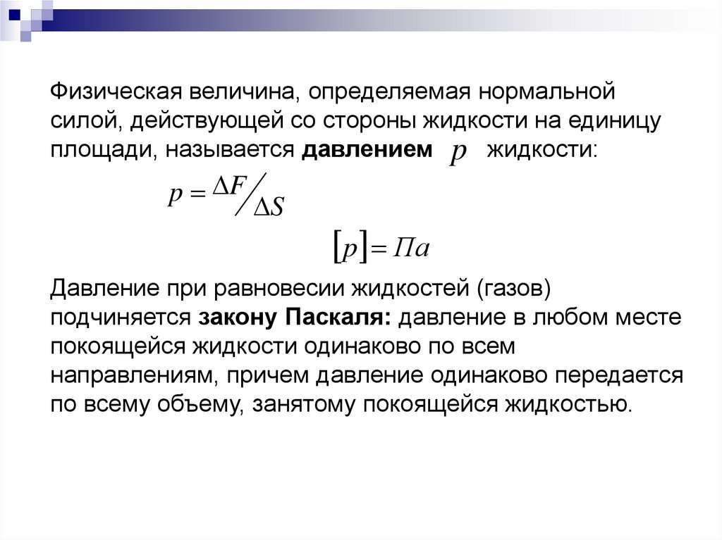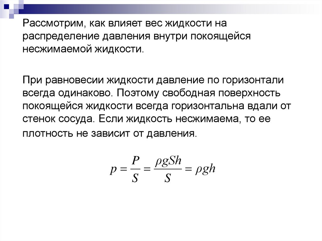 Рассмотрим, как влияет вес жидкости нараспределение давления внутри покоящейся