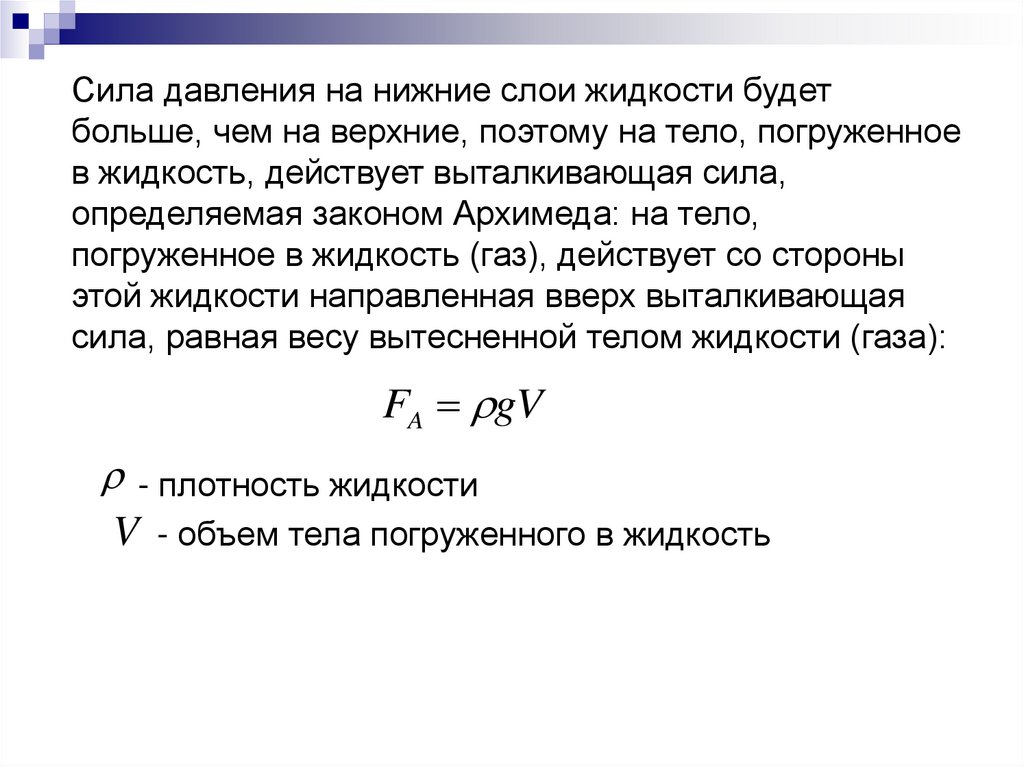 Сила давления на нижние слои жидкости будетбольше, чем на верхние, поэтому на тело, погруженное